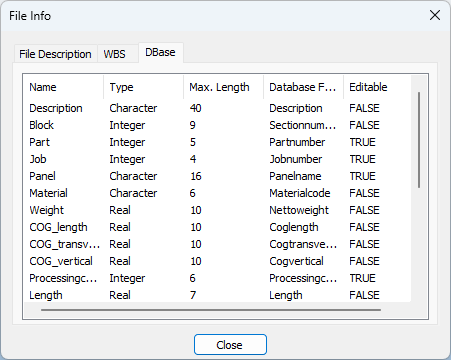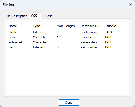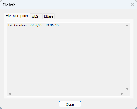 When a .3hm file is opened, the menu option File > File Info is enabled. By this option the user can get additional information about the file such as the creation date and time, file description, work breakdown structure, field type, and the field maximum length.