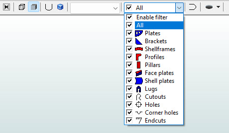 The drop-down menu lists the filtering types. If a part is selected here, selecting other types of parts in Hull Viewer is not possible.