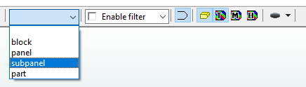 The selection filter drop-down menu in the toolbar can be used to select and filter out multiple parts of the construction. The selection filter does not change the selection directly, but it prevents both the selection and deselection of the construction types which are not selected in the filter.