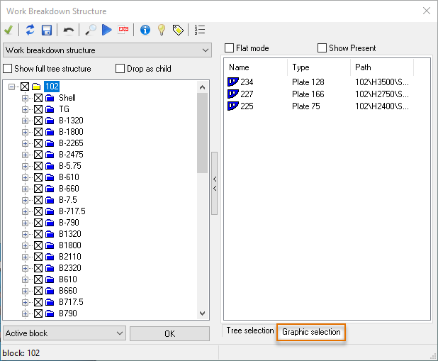 The Work Breakdown Structure dialog shows an overview of the selected parts when Graphic selection below the list is clicked:
