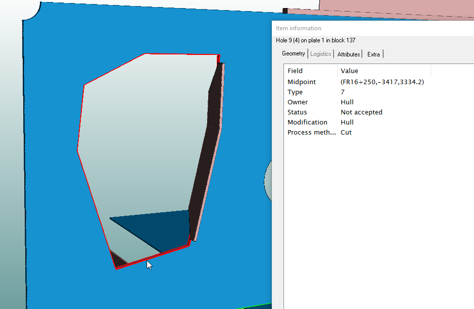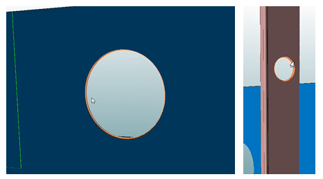 When a hole is selected, its contour is slightly thicker in order to make it stand out better. The selected hole is highlighted based on its contour, in a 3D manner, to include both the moulded side and the thickness side of an object. Both the standard and arbitrary holes are selectable.