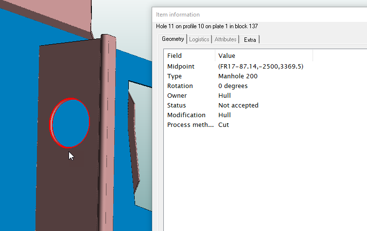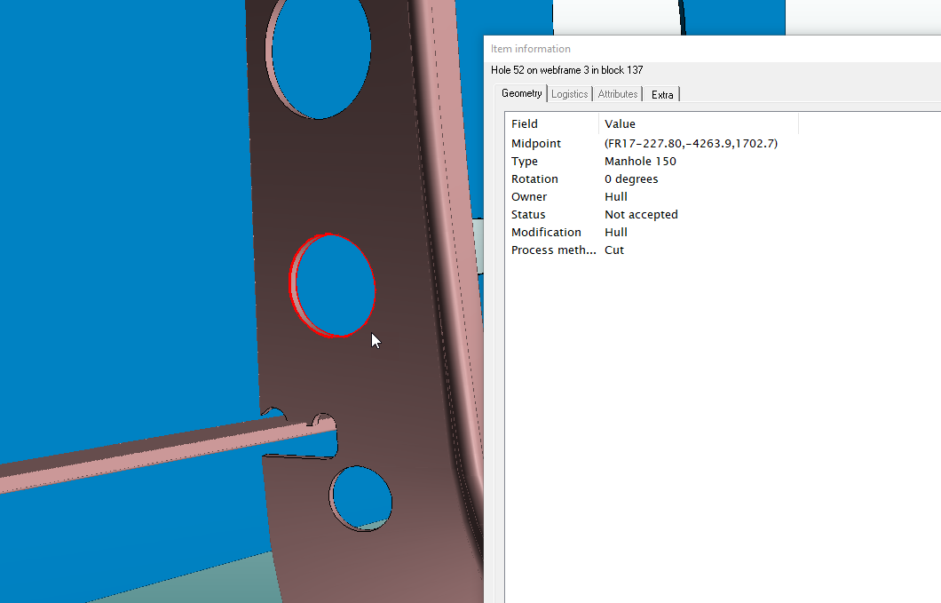 Holes in Hull Viewer have a "selection ring" around the hole perimeter to make them selectable by clicking near the ring of the hole. The selection ring functionality also enables you to click an object through the hole of a plate, and then that other plate behind is actually selected, not the parent plate.