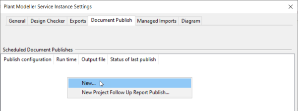 After the export configuration for 3D models is available, you can configure Plant Modeller Service Instance to run the configuration automatically at fixed times. You can also set Plant Modeller Service Instance to look for new documents and/or publications during each area update, to synchronize the changes with eShare automatically.