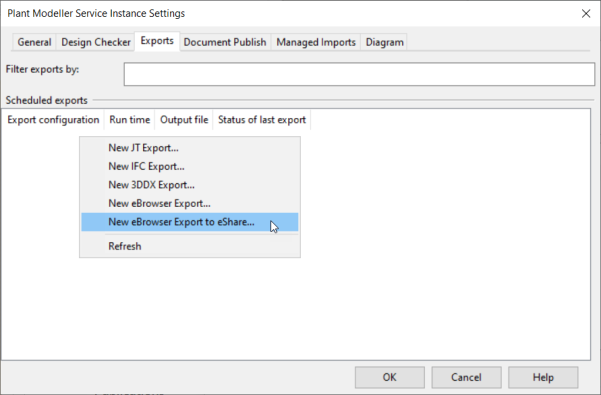 In the Scheduled exports pane, right-click and select New eBrowser Export to eShare.