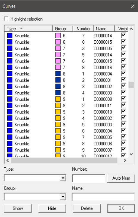 You can modify the curve type, curve number, group number, and curve name of the selected curve. Select the curve to modify, and enter the new values to the Type, Number, Group and Name fields, respectively.