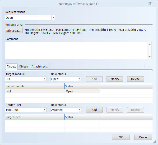 You can modify a work request by making a new reply. When replying to a work request, you can change status values, assign objects, manage attachments, and add comments. All comments are displayed as a discussion chain in the Work Request Manager dialog.