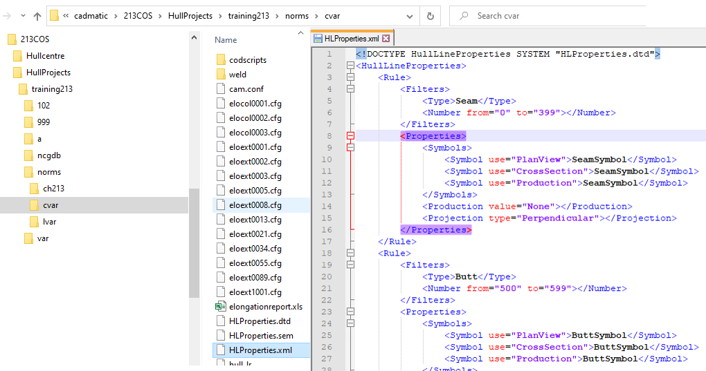 Extra hull line properties are defined in the HLProperties.xml file which is located in the project's norms folder, subfolder cvar. Open the HLProperties.xml file with a text editor to edit the rules for the extra hull line properties.