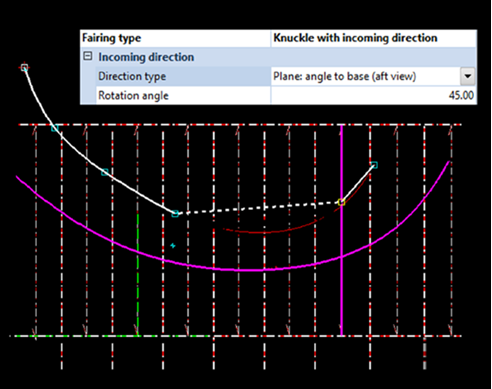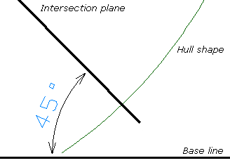 The angle has a default value of 45 degrees and can be manually adjusted. It is measured against the rotation angle of the base line. The viewing perspective is perpendicular to the hull shape at the current point as seen from a top view.