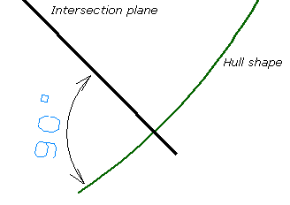 The angle has a default value of 90 degrees and can be manually adjusted. It is measured against the rotation angle of the hull shape at the current point, from the viewing perspective of an orthogonal aft view.