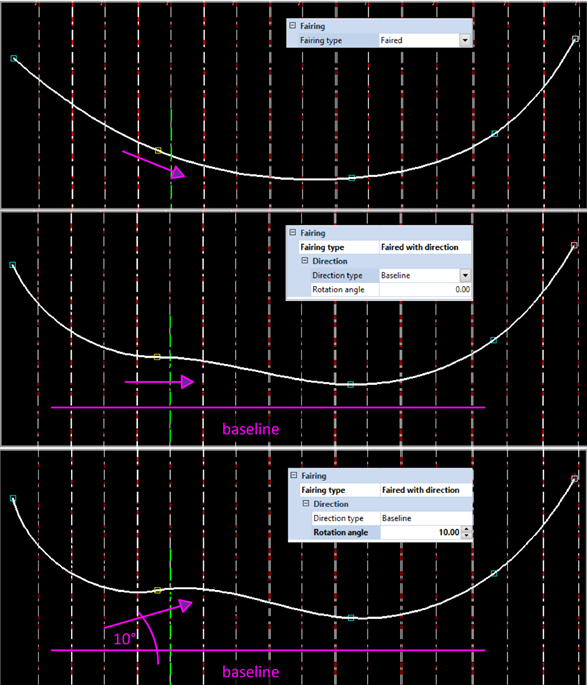 When selecting Baseline as direction type, the direction of the point on the hull line aligns with the baseline direction.