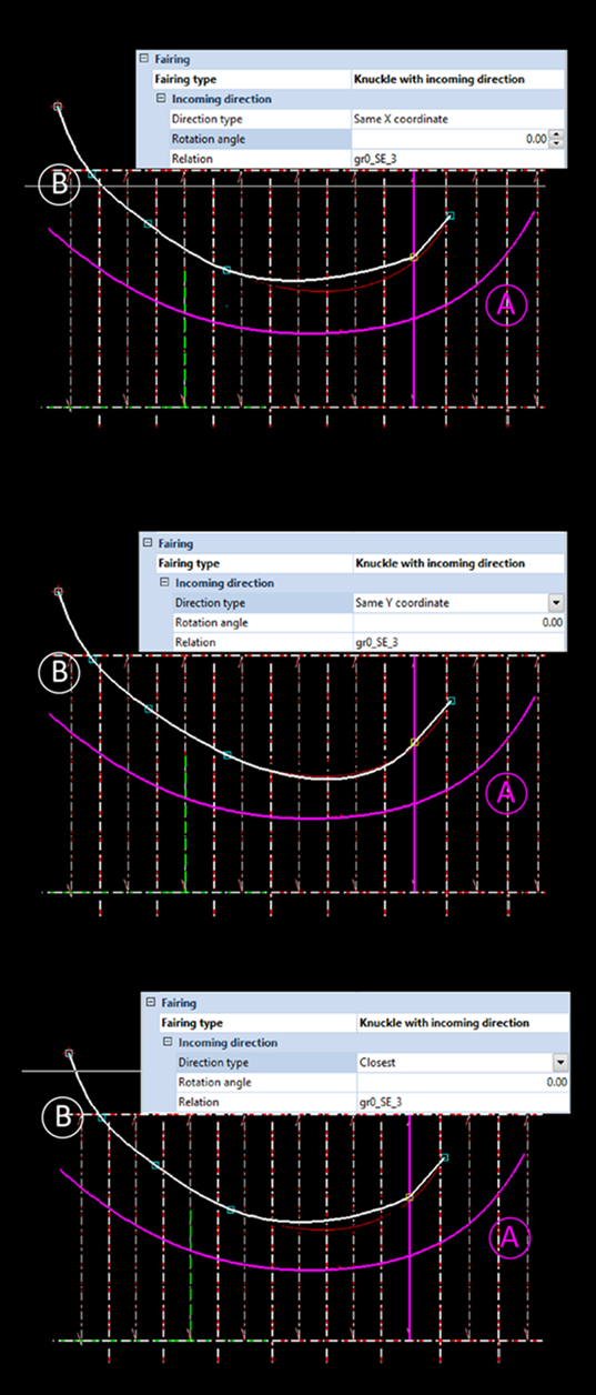 When you define curve directions based on hull line relations, the result will be a topological direction. In case a curved hull line 'A' is used as a relation to define a point in hull line 'B', the curve directions of hull line 'A' can be used to define the fairing of hull line 'B'. (See image below this section.)