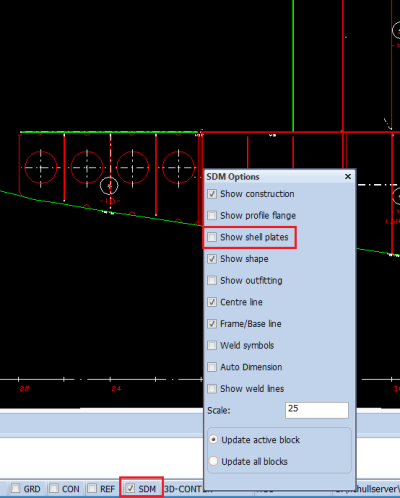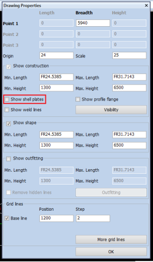 You can display the shell plates in cross section by activating the Show shell plates option in the dialog box. You can activate this option during the following actions: