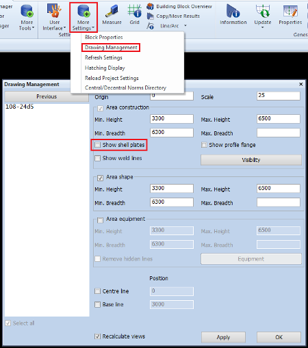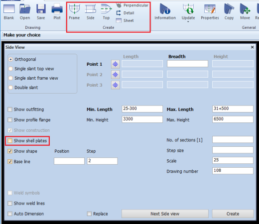 When creating a frame view, a side view, a top view or a perpendicular view, the property Show shell plates can be enabled in the pop up window to include shell plates in the view. When starting the Create view function, this property is disabled by default.