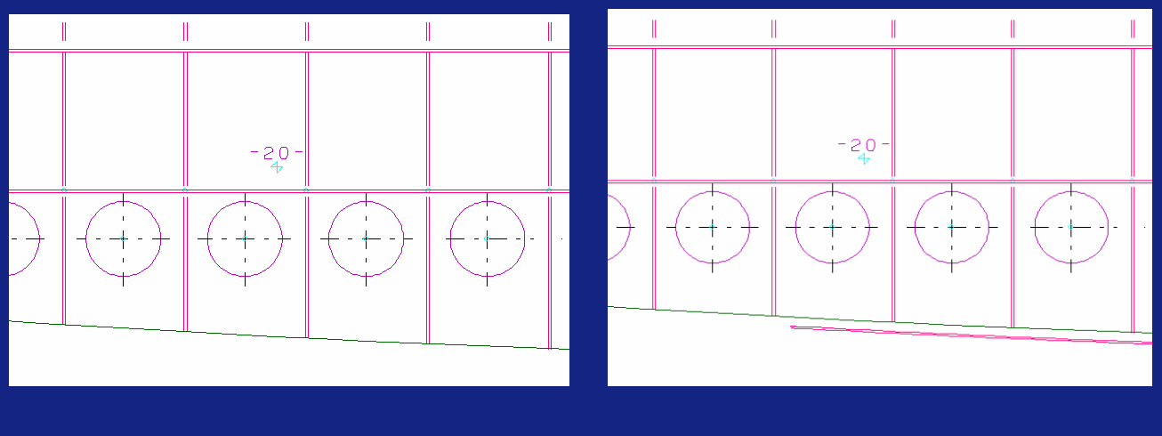 The option to display shell plates in cross section is available in any view created in 2D-Contek, 3D-Contek, HiLTop and Production Information applications. The image below to the left shows a view that does not show intersecting shell plates. The image below to the right shows the same view, but here the intersecting shell plate is displayed.