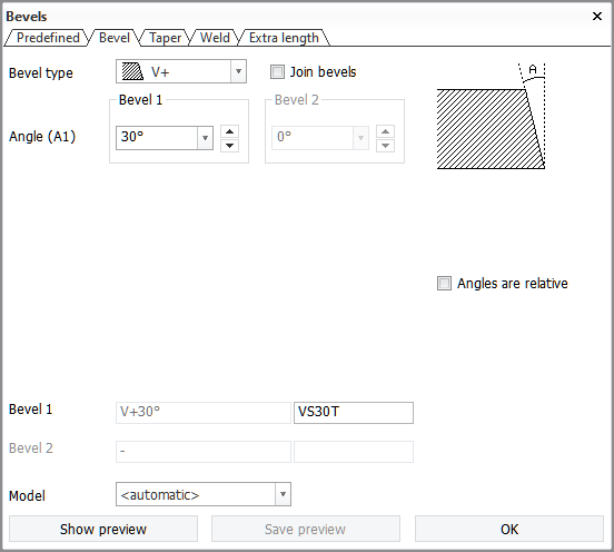 You can adjust the properties of predefined bevels while inserting or modifying single bevels in the 2D-Contek & 3D-Contek and Shell applications, in the Bevel dialog which opens when you start the insert or modify function. The Predefined tab is active when you start the functions. Select the predefined bevel that you want to insert, or to apply if you are modifying an existing bevel.