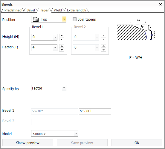 Join tapers – When selected, forces the same values for Bevel 1 and Bevel 2.