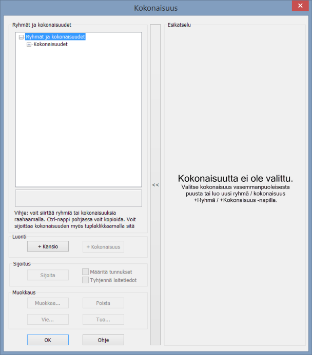 Kansioita voidaan määritellä valitsemalla Kokonaisuudet -dialogissa Ryhmät ja kokonaisuudet osiosta jokin ryhmä: