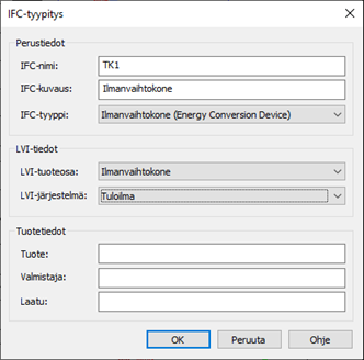 Valitse IFC-tyyppi valitulle laitteelle (esimerkiksi Ilmanvaihtokone (Energy conversion device)).