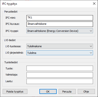 Tällä toiminnolla voit muokata laitteelle määriteltyä IFC-tyypitystä tai poistaa tyypitystiedon laitteelta. Itse määritys tehdään toiminnolla IFC-tyypitä osa.