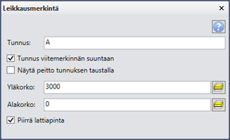 Leikkausta varten lisätään kuvaan leikkausmerkintä. Leikkausmerkinnällä määritetään alue (myös korkeussuunnassa), josta leikkaus tehdään. Alue määritetään kolmella pisteellä, kahdella ensimmäisellä pisteellä näytetään leikkauslinja ja kolmannella leikkauksen syvyys. Leikkausmerkinnän asetuksissa määritetään lisäksi leikkauksen ylä- ja alakorko, tunnus, tunnuksen suunta sekä peittoelementti. Leikkausmerkintään voidaan myös piirtää lattiapinta, jos alakorko on lattiapinnan alapuolella. Korot on myös mahdollista hakea kerrosasetuksista.