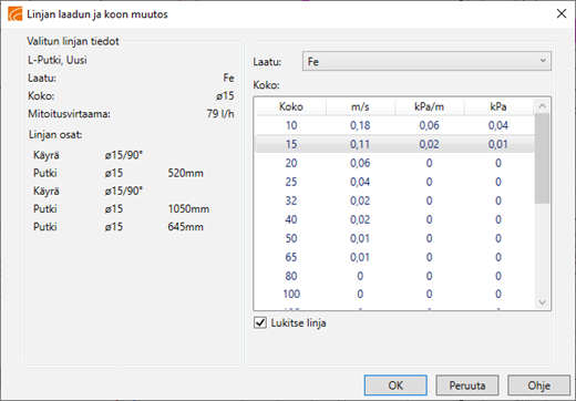 Toiminnolla muutetaan verkoston linjan (risteyspisteiden välissä olevat putket) laatu ja koko. Dialogissa näkyy valitun laadun eri putki- ja kanavakokoja vastaavat kitkapainehäviöt ja nopeudet. Putki/kanavalinja on mahdollista samalla lukita, jolloin mitoitus ei sitä enää muuta mitoitettaessa verkosto uudestaan.
