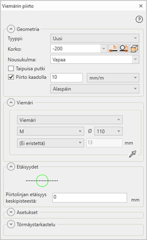 Viemäriä voidaan piirtää myös kaadolla. Tällöin Geometria osiossa valitaan Piirto kaadolla -asetus ja määritetään kaadon määrä ja suunta.