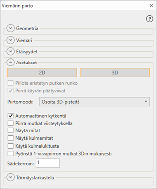 Piirtomoodi: Piirtomoodilla valitaan osoituspiste putken mallinnuksessa. Piste voidaan siis näyttää joko 2D-elementin tasossa (nolla korossa) tai 3D elementin tasossa.
