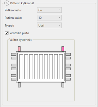 LVK-patterin kytkennät voidaan määrittää patterin sijoitusvaiheessa tai myöhemmin kytkentöjen yhteydessä. Jos patterin kytkennät määritetään jo sijoitus vaiheessa, valitaan sopivat kytkennät patterin kuvasta. Venttiilin piirto -valinnalla voidaan patterin symbooliin lisätä venttiili näkyviin. Patterille määritetän myös kytkentöjen laadut ja koot. Toiminto muistaa viimeksi käytetyt arvot, jolloin samanlaisia pattereita on nopea lisätä kuvaan peräkkäin.