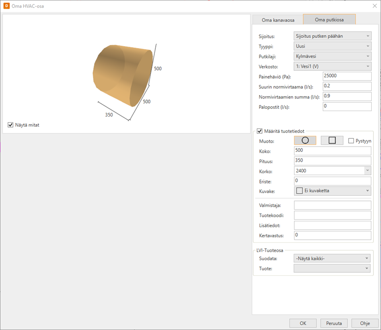 Putkeen lisättävälle osalle määritetään tuotetiedot: painehäviö (Pa), geometria ja eristeet sekä tarvittaessa Valmistaja, Tuotekoodi, Lisätiedot ja Kertavastus.
