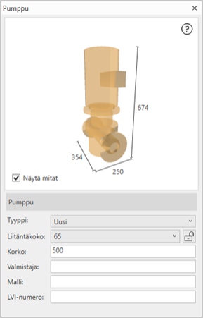 Pumpulle voidaan sijoitus vaiheessa valita koko ja korko, mutta ne voivat määräytyä myös putken mukaan, johon pumppu liitetään. Eli jos halutaan sijoittaa putkeen tietyn kokoinen pumppu valitaan pumpulle koko, muuten valitaan Koko -kenttään Putkikoon mukaan -valinta. Tällöin pumpun kooksi valitaan automaattisesti lähinnä putken kokoa vastaava pumppu.