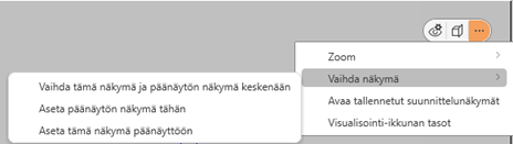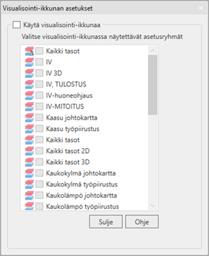 Visualisointi-ikkunan käynnistyksessä voi valita mitä asetusryhmiä ikkunassa haluaa näkyvän (ilman valintaa näkymä on sama kuin päänäytössä). Asetusryhmien lisäksi visualisointi-ikkunassa voi käyttää suunnittelunäkymiä tai päänäytölle voi muokata sopivan näkymän, jonka sitten voi vaihtaa visualisointi-ikkunaanVaihda näkymä -valikosta.
