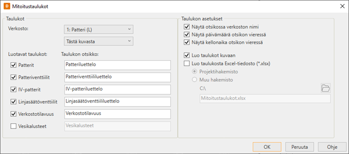 Projektin mitoituksen ja tasapainotuksen jälkeen kuvaan voidaan tuoda taulukoiksi verkoston patterien, patteriventtiilien, IV-pattereiden, linjasäätöventtiilien mitoitustiedot. Lisäksi verkostosta voidaan laskea tilavuus.