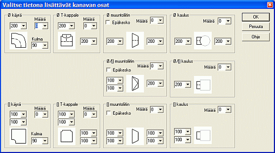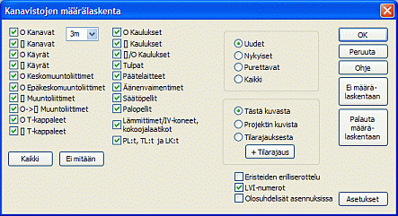 Kanavaosat lasketaan kappaleina. Käyräkappaleen kulmat pyöristetään seuraavaksi suurimpaan kulmaan (15, 30, 45 ja 90 astetta). Jos pyöreän kanavan pituus on valittu, saadaan myös jatkoliittimien määrät kanavakokokohtaisesti. Päätelaitteista käytetään ensisijaisesti KUVASSA-attribuutin arvoa, joka on aina valmistajan ilmoittaman esitystavan mukainen. Kanavan osat eritellään laaduittain.