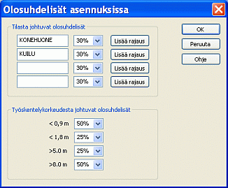 Asetukset-painikkeella avautuvassa dialogissa määritetään käytettävät olosuhdelisät. Tilasta ja työskentelykorkeudesta johtuvat lisät summataan. Esim IV-konehuoneessa 5.5 m korkeudessa olevan kanavan asennustyön lisä on 30% + 25% = 55 %.