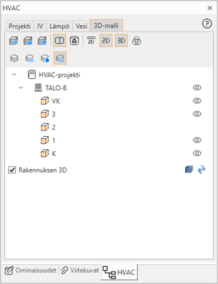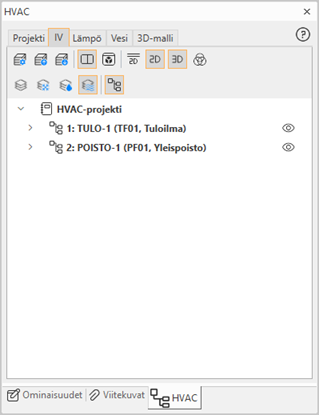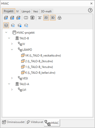 Projektipuussa voidaan valita näytetäänkö kanavien ja putkien 2D, 3D vai molemmat esitykset. Putkille voidaan myös valita 2D esityksestä 1 viiva tai 2 viiva esitys. Lisäksi projektipuussa voidaan vaihtaa asetusryhmiä, eli mitkä tekniikat kuvasta näytetään (kaikki, lämpö ja jäähdytys, vesi ja viemärit, iv).