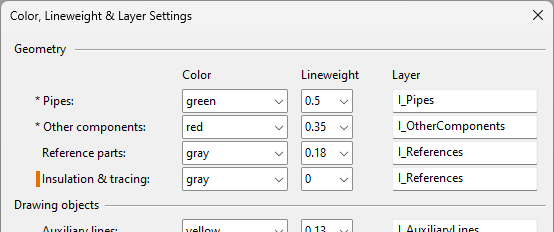 The visualization of the insulation markings can be configured in the Color, Lineweight & Layer Settings dialog. You can select the color, the lineweight, and the layer that insulation markings are to use.