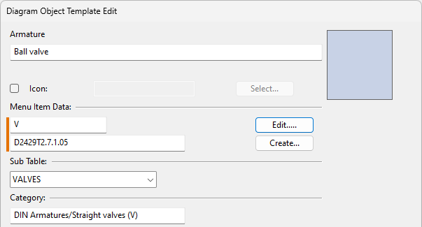For example, if an imported DEXPI object is mapped to the 'Ball valve' template, the MenuItmData value is: