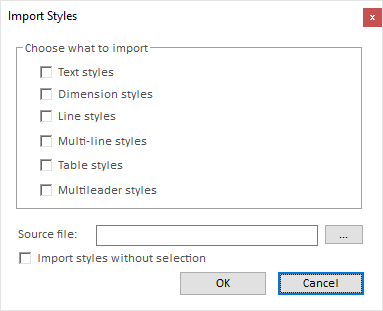 Import styles – Allows importing styles from a DWG or DXF file. The Import Styles dialog opens for specifying which styles to import and whether the user is to accept each style separately.