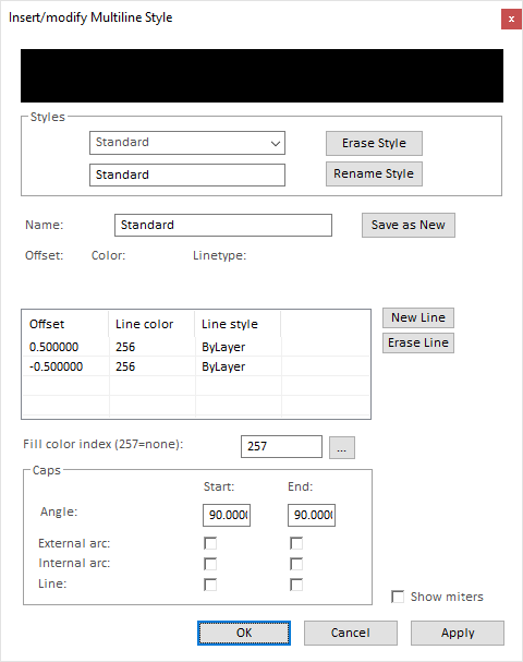Insert/modify – Opens the Insert/modify Multiline Style dialog for defining multiline style.