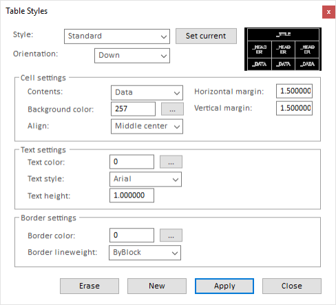 Insert/modify – Opens the Table Styles dialog for defining table styles.