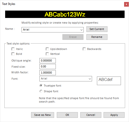 Insert/modify – Opens the Text Styles dialog for defining text styles.
