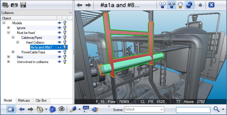 In the following example picture, the hierarchy menu is set to display collisions listed in a collision report file, and the user has selected to examine a location where a hard collision occurs: a cable tray is colliding with a pipe.