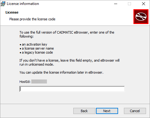 To use the full version of eBrowser, enter an activation key, license server name, or legacy license code to activate full version. If you do not have a license yet, leave the field empty and you can use eBrowser in unlicensed mode. You can update the license information later in eBrowser settings.