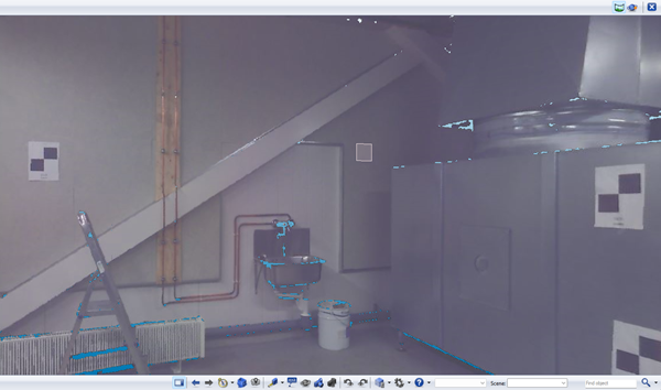 You can navigate in a point cloud in the same way that you navigate in a 3D model, and you can take snapshots and measurements, for example, but measurements might not be exact. If the point cloud file contains scanner position information, it is possible to view the point cloud in bubble view mode that is fixed at the scanner position and does not allow moving the camera.