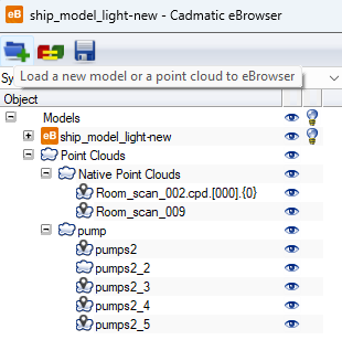 Point clouds are located in a separate Point Clouds branch of the object tree, and its subnodes are alphabetically sorted. The visibility of point clouds can be toggled by clicking the eye icon.