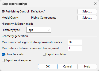 In the Step export settings dialog, you can specify settings for exporting 3D model objects in STEP (Standard for the Exchange of Product Data) format.