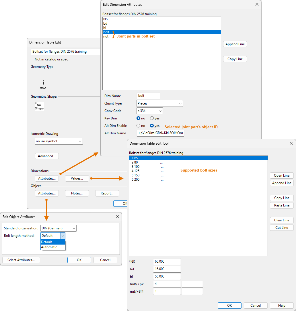 Bolt Sets can include bolts, nuts, and washers of various sizes. Their dimensions must be defined in dimension tables, while their other properties (such as standards and materials) are defined in catalog parts.