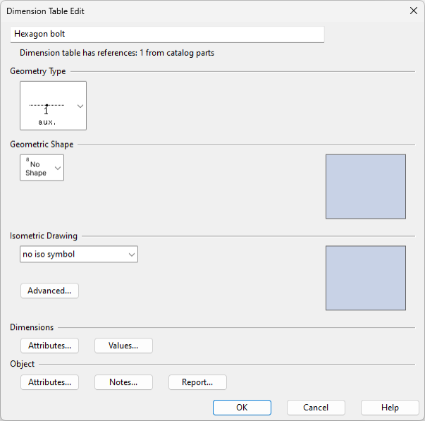 In the Dimension Tables section, create dimension tables that describe the dimensions of the bolts, nuts, and washers included in bolt sets. The same dimension table can be used for all catalog parts with the same physical dimensions.