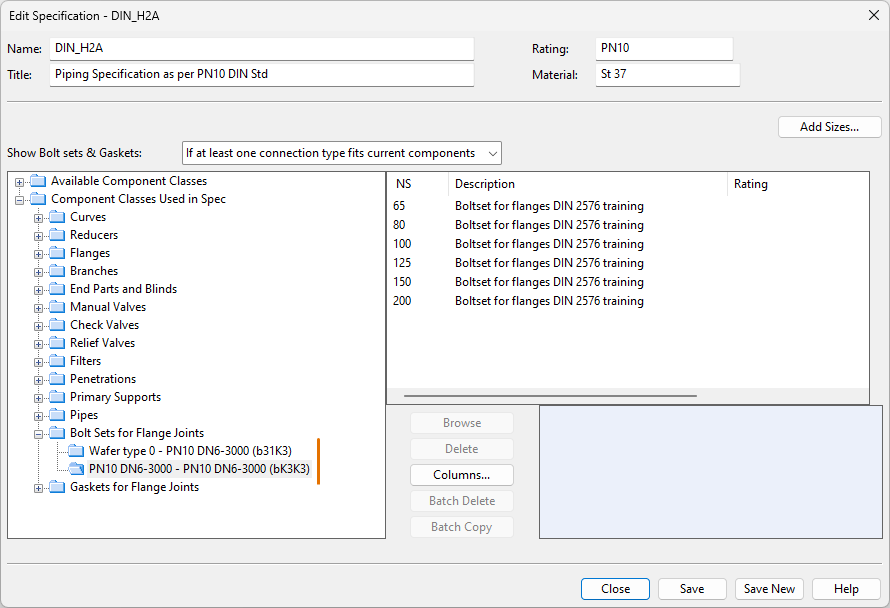 To include joint materials in Plant Modeller sessions and generated reports, bolt sets must be assigned to the relevant connection types in the piping specifications.