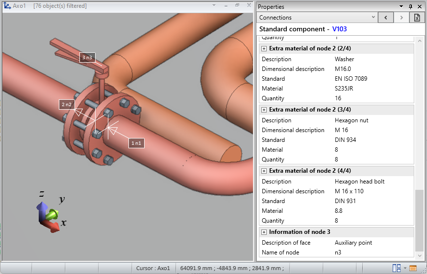 After inserting a flange joint into the 3D model, the properties of the joint materials determined through the piping specification can be viewed by selecting the component on either side of the connection and opening the Connections tab in the Properties pane.